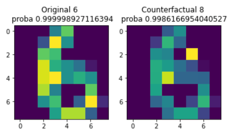 <br>from alibi.explainers import CounterFactual<br>instance = test_digits_X[0].reshape(1, 8, 8, 1)<br>cf = CounterFactual(digits_estimator, instance.shape)<br>explanation = cf.explain(instance)<br>predicted_class = explanation.cf['class']<br>