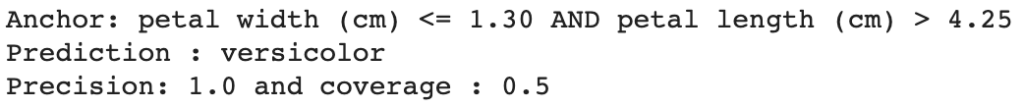 <br>from alibi.explainers import AnchorTabular<br><br>class_names = list(iris_dataset.target_names)<br>instance = test_iris_X.iloc[0].to_numpy()<br><br>explainer = AnchorTabular(sklearn_classifier.predict_proba,feature_names)<br>explainer.fit(train_iris_X.to_numpy(), disc_perc=(25, 50, 75))<br>explanation = explainer.explain(instance, threshold=0.95)<br><br>prediction = class_names[explainer.predictor(instance.reshape(1, -1))[0]]<br>print('Anchor: %s' % (' AND '.join(explanation.anchor)))<br>print(f'Prediction : {prediction}')<br>print(f'Precision: {explanation.precision} and coverage : {explanation.coverage}')<br>