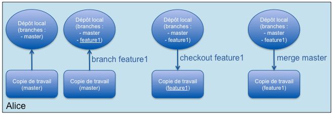 Commençons par l'initialisation d'un projet géré à l'aide de Git par un développeur seul (Alice). Celle-ci travaille sur sa copie de travail locale, comme avec Subversion, mais avec un dépôt local cette fois-ci :