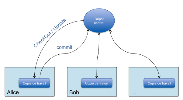 Rappelons tout d'abord le principe de fonctionnement de version (et de tous les systèmes de gestion de version non-distribués) afin de bien saisir les différences entre distribué et centralisé. Subversion est donc composé d'un dépôt unique sur un serveur où se trouve l'ensemble des fichiers, de leurs versions ainsi que des branches qui permettent de gérer plusieurs versions du projet en parallèle. Les développeurs (Alice et Bob par exemple) récupèrent une version du projet sur leur poste de travail (avec la commande checkout) pour pouvoir commencer à travailler dessus. Au quotidien, ils mettent à jour leur copie de travail local (update) depuis le serveur Subversion et renvoient leurs modifications (commit) vers ce même serveur. Ce mode de fonctionnement permet aux développeurs de travailler en parallèle sur le projet, de partager leurs modifications et de versionner les fichiers qu'ils modifient.