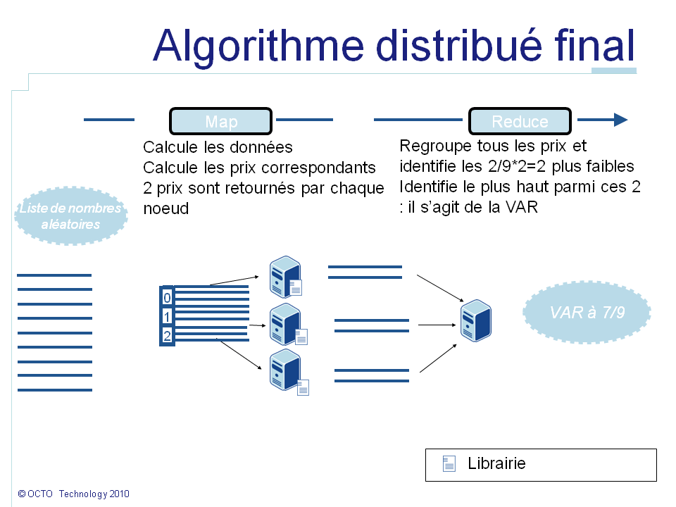 D'un point de vue métier, l'estimation des risques est devenue de plus en plus importante pour les institutions financières afin de prévenir les pertes sur des marchés fluctuants. De plus, les nouvelles normes de régulation telles Bâle III et Solvabilité (Solvency) II prennent en compte la VAR dans leurs exigences. L'efficacité des calculs de ces valeurs est un pré requis forme pour le système d'information des institutions financières. A travers un exemple très simple, cet article a montré que ces calculs reposent sur la génération de données aléatoires et la réalisation de calculs mathématiques pour évaluer la valeur du portefeuille pour chaque échantillon. Le nombre d'échantillons requis et parfois la complexité dans la méthode de calcule nécessitent des architectures spécifiques pour terminer ces calculs dans des temps raisonnables. La grille de calcul est l'architecture la plus à jour pour répondre à ce genre de problématique. Le pattern map reduce est l'une des façons les plus simples d'écrire un algorithme qui bénéficie de l'accélération rendue possible par le calcul en grille. La compréhension des besoins métiers est un point important pour optimiser le code. Dans cet exemple, ignorer les résultats intermédiaires permet d'accélérer le calcul. Dans un autre article, je décrirai une implémentation de cet exemple en utilisant un intergiciel (middleware) de grille de calcul et je donnerai quelques chiffres de performance.