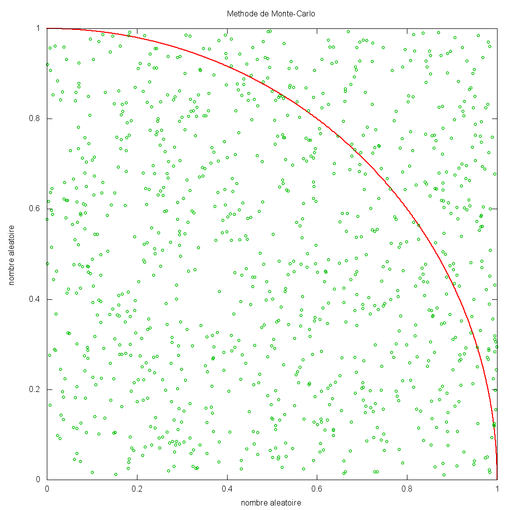 La méthode utilisée repose sur un algorithme basé sur un échantillon aléatoire. Cette technique est connue sous le nom de méthode de Monte-Carlo, en référence au jeu de hasard des casinos de Monte-Carlo. Pour décrire brièvement comment une telle méthode peut conduire à un résultat précis en se basant sur des nombres aléatoires, nous allons détailler comment calculer le nombre . Prenons un carré de côté 1.0 et un quart de cercle de rayon 1.0 comme sur le schéma ci-dessous.