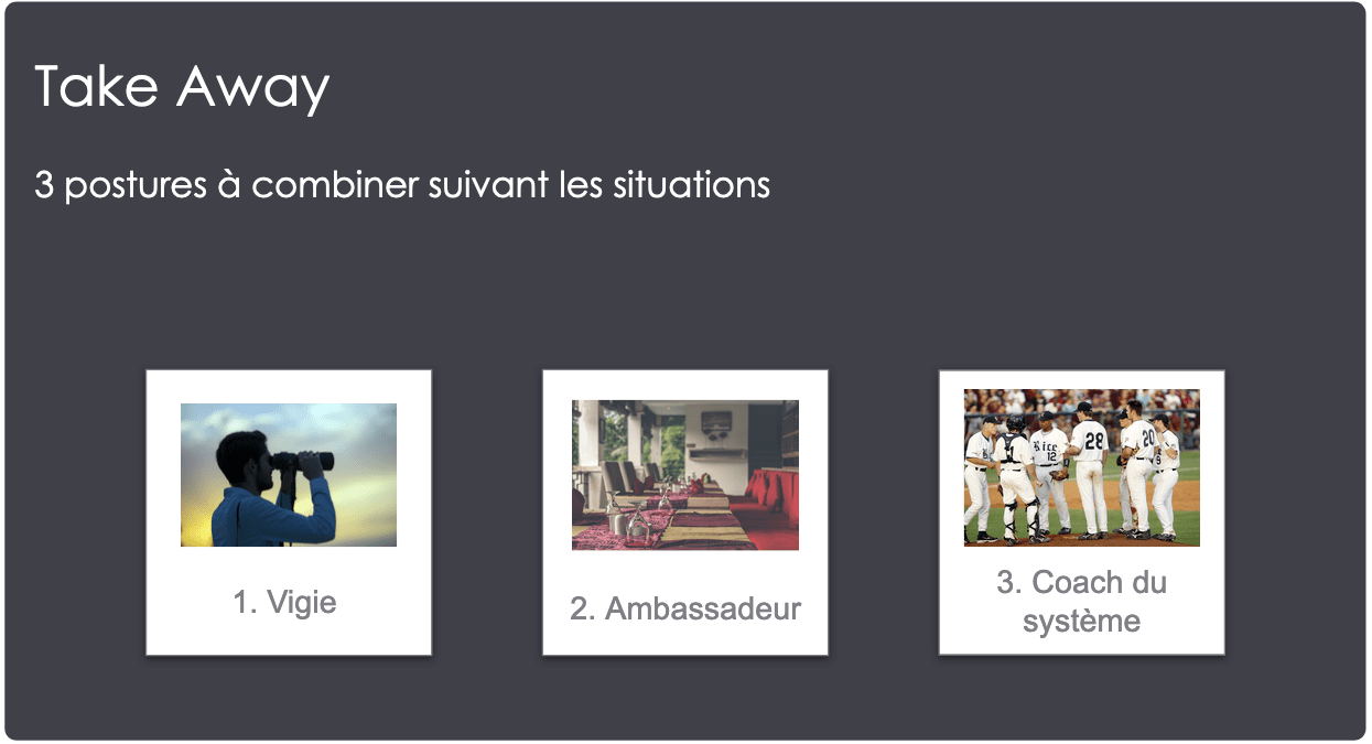 - En identifiant la bonne posture en fonction du contexte. Par exemple, en composant avec les postures de Vigie, Ambassadeur et Coach.