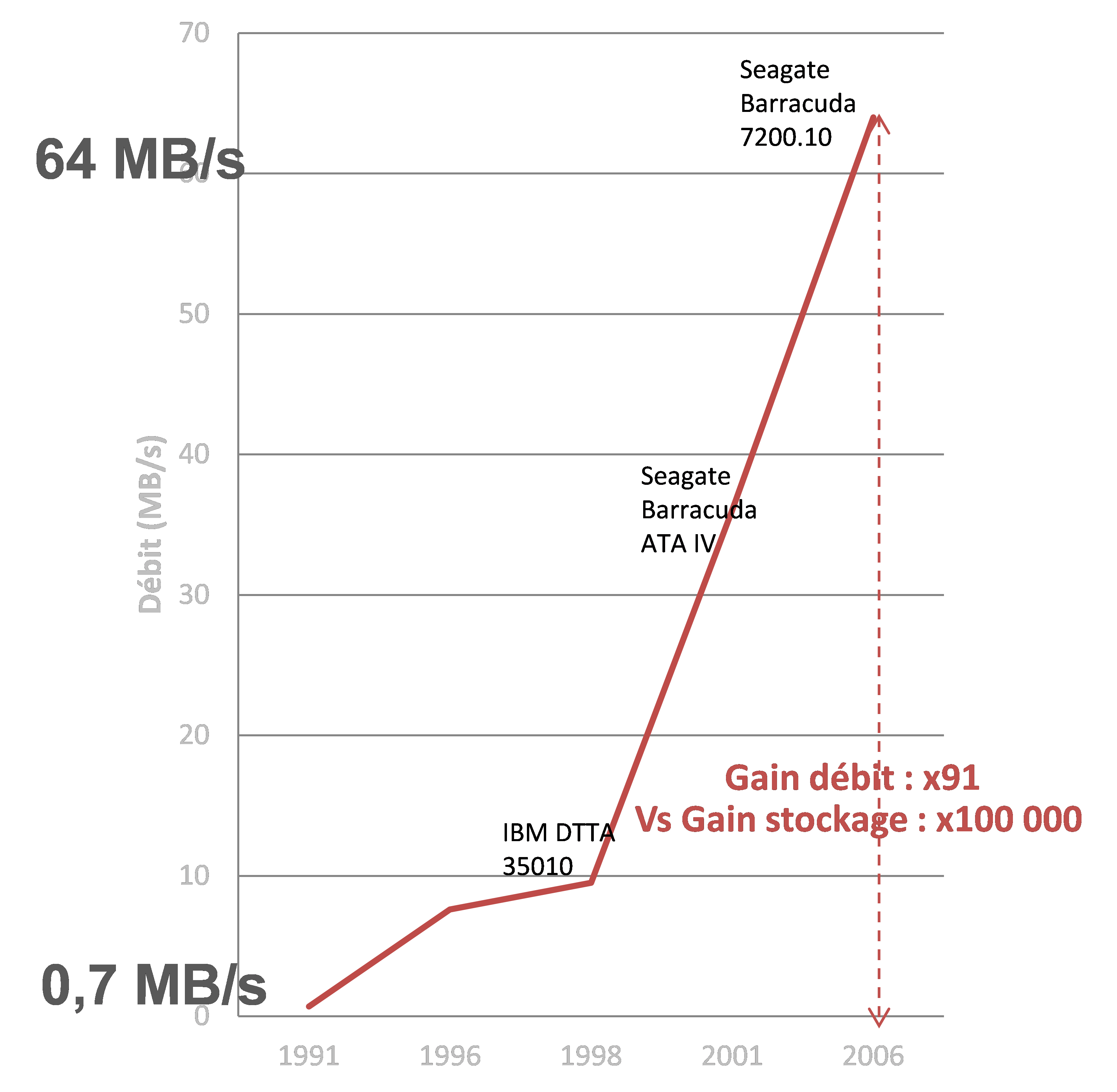 Alors où est le problème, qu’est qui fait que nos architectures décisionnelles aujourd’hui, non contentes de coûter de plus en plus chères, sont aussi en incapacité à se projeter sur des Tera ou des Peta de données. C’est bien simple, un vilain petit canard ne suit pas cette fameuse loi de Moore et il tire vers le bas tous ses petits camarades. Ce vilain petit canard c’est le « disk throughput », soit la capacité de débit des disques. En effet, quand la capacité de stockage des disques a augmenté de 100 000, le débit lui n’a augmenté que de 100… Donc, en schématisant on peut stocker 100 000 fois plus d’information, par contre, ce stockage prendra 1000 fois plus de temps. Allo Houston, on a un problème…