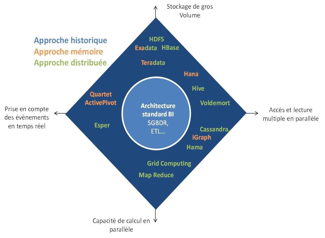 - Approche appliance : les données sont montées en mémoire sur des systèmes capables de supporter plusieurs To de RAM.