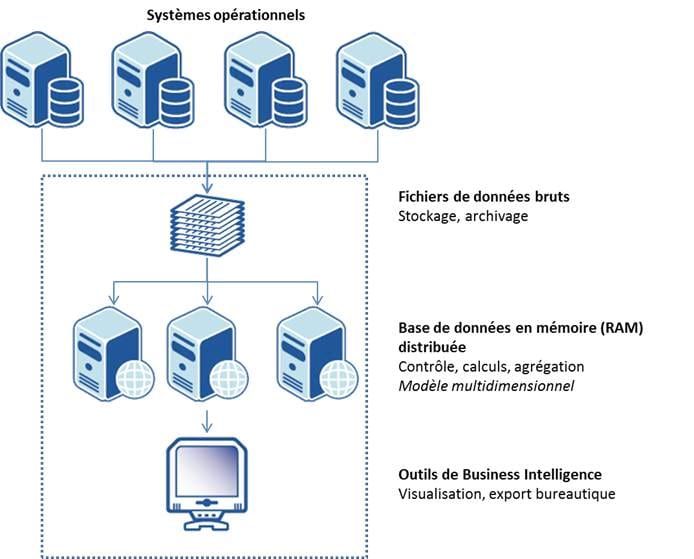 L’architecture d’un système In Memory repose sur la capacité à monter en RAM l’ensemble des données à analyser dans un système unique qui assure l’ensemble des fonctions décisionnelles.