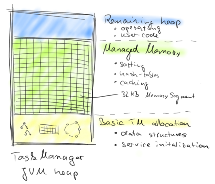 Flink a d’abord implémenté la première solution, c’est à dire l’utilisation de Non-Direct ByteBuffer alloués dans la Heap. Les ByteBuffer sont nommés MemorySegment, ils sont fixés à 32 Ko en taille et sont gérés par le MemoryManager. Ce dernier a pour rôle de distribuer les bons segments aux opérateurs (filter, join, sort, groupBy, etc…).
