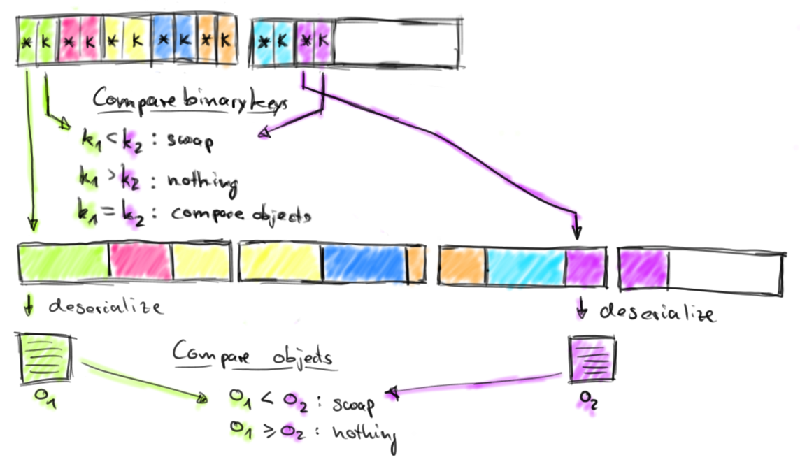 Le modèle est le suivant : on stocke une collection contiguë de pointeur+clé dans un ByteBuffer. Lorsqu’un opérateur (join, groupBy, sort, etc…) effectue la comparaison entre les enregistrements, il le fait sur les clés. Il est donc plus intéressant de les séparer de leur valeur (souvent plus volumineuse). Les clés sont de taille fixe ce qui rend le parcours de la collection efficace sans dé-sérialisation (vous vous rappelez les RDBMS au début, c’est la même chose). On va faire une comparaison binaire entre les clés (ou les premiers octets des clés de type string), et accéder à la valeur seulement quand on en a besoin. Cet accès se fait via le pointeur qui se trouve à côté de la clé. Une fois les octets récupérés depuis le ByteBuffer, on les dé-sérialise en objet.