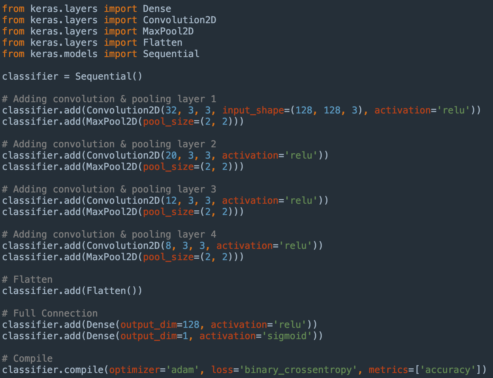 On voit la concision que permet le framework. Une ligne de code suffit pour ajouter une couche dans l'architecture de notre réseau. Maintenant que le modèle est construit, il nous faut l’entraîner à la détection de dessins de voiture.