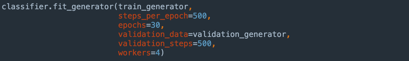 Nous en avons profité pour utiliser une feature de la bibliothèque Keras : la classe ImageDataGenerator, et la méthode associée fit_generator. Cette dernière nous permet de charger en mémoire uniquement les images du batch concerné par l’étape d’apprentissage. En effet, il existe deux stratégies pour utiliser les images lors de l’entraînement. La première consiste à charger les quelques 70 000 images du train et du test chargées dans des objets python (des tableaux de pixels en l’occurrence), ce qui nécessite un espace mémoire conséquent. La seconde en revanche, consiste à lire sur disque uniquement les images nécessaire au batch en cours, ce que permet très simplement la classe ImageDataGenerator. Cette méthode génère plus de lectures de données sur disque, mais permet d’allouer un maximum de mémoire aux calculs nécessaires à l’apprentissage.