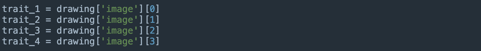 Appliquons le parser à une catégorie, par exemple airplane, en extrayant la valeur image de l’objet drawing. On pourrait s’attendre à obtenir un tableau de valeurs de pixels ou une image. En réalité, le résultat est un peu plus riche : il s’agit d’une liste des différents traits qui composent le dessin. Chaque élément de cette liste est un tuple : la première coordonnée du tuple est l’évolution en abscisse du trait, et la seconde est l’évolution en ordonnée ! Par exemple, prenons une image composée de 4 traits :