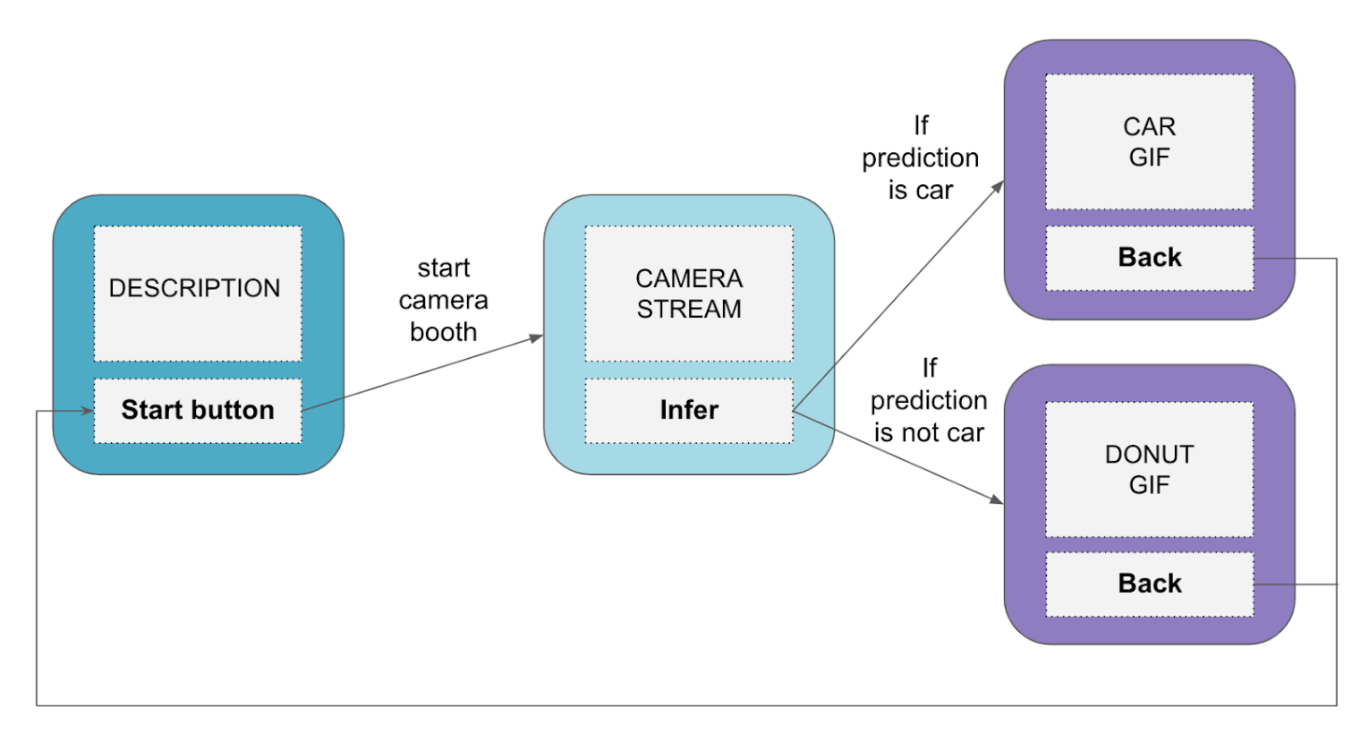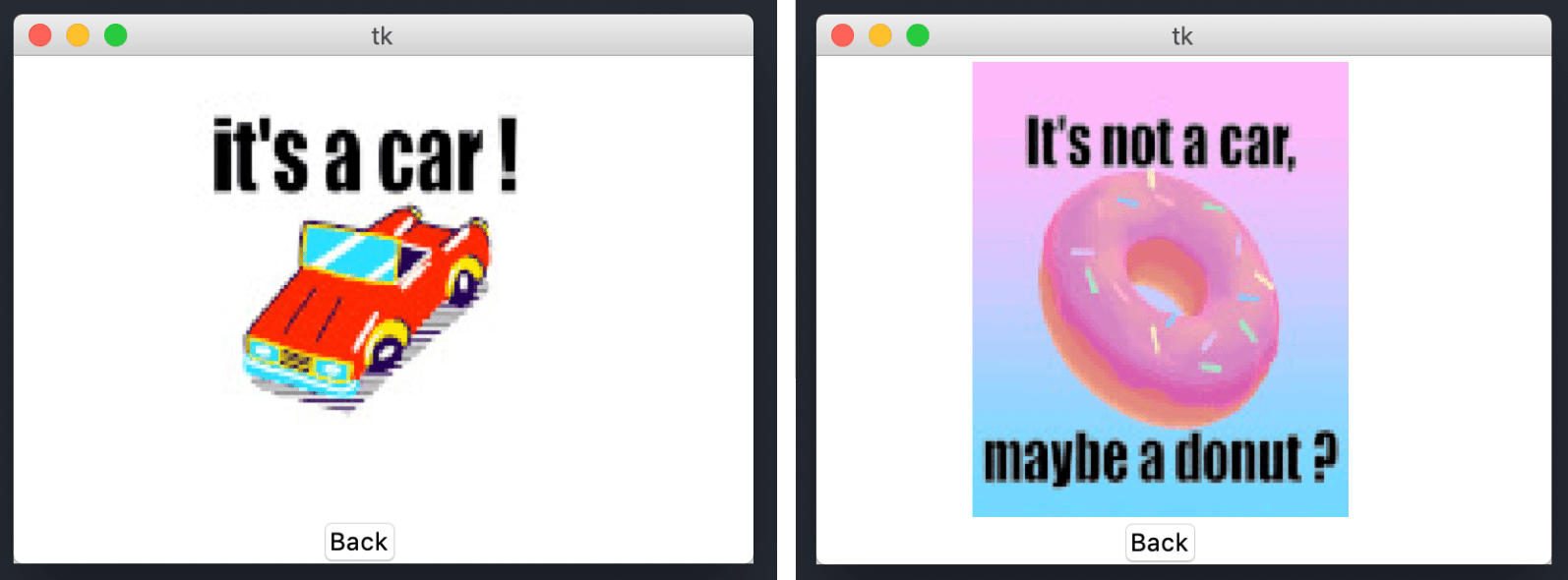 - Un GIF : Le modèle fait une inférence sur la photographie et si la prédiction est “voiture”, le troisième écran affiche un GIF de voiture. Sinon, il affiche un GIF de donut. Un bouton “back” permet de revenir à la page d’accueil