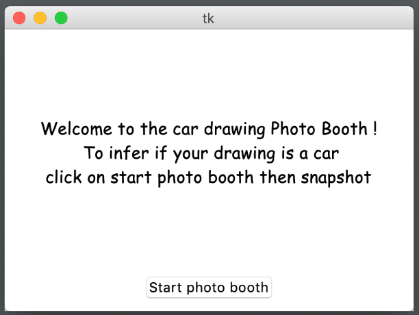 - Un photo booth : Une fenêtre affiche le flux vidéo en provenance de la caméra. L’utilisateur peut bouger la caméra et voit le flux correspondant à l’écran. Il positionne la caméra au dessus du dessin qu’il souhaite photographier, et une fois prêt, il peut cliquer sur un bouton “infer” qui renvoie au troisième écran