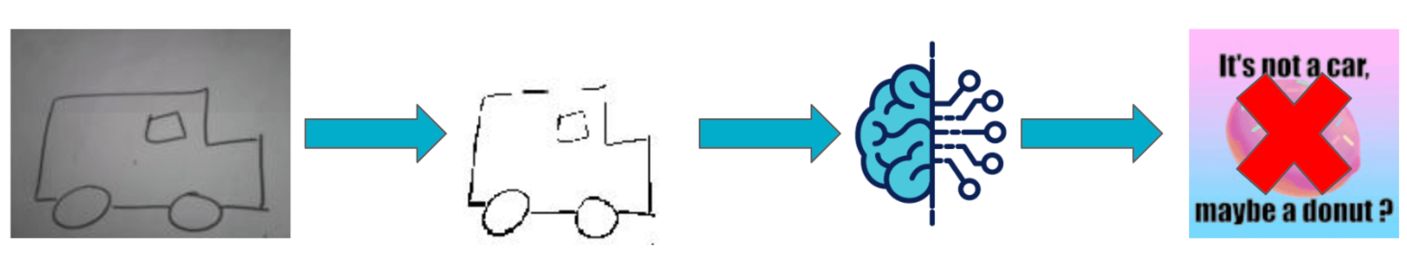En revanche, nous avons pu constater que le modèle pouvait être mis en défaut par des problèmes de mise en scène. Sur la figure 10, on constate que le dessin en entrée est une voiture. En revanche, le preprocessing tend à rendre les traits trop fins. À certains endroits, ils ont même disparu ! Pour ce même dessin, en forcissant les traits, nous obtenons une prédiction correcte. Ainsi, l’épaisseur des traits est un paramètre influant la prédiction.