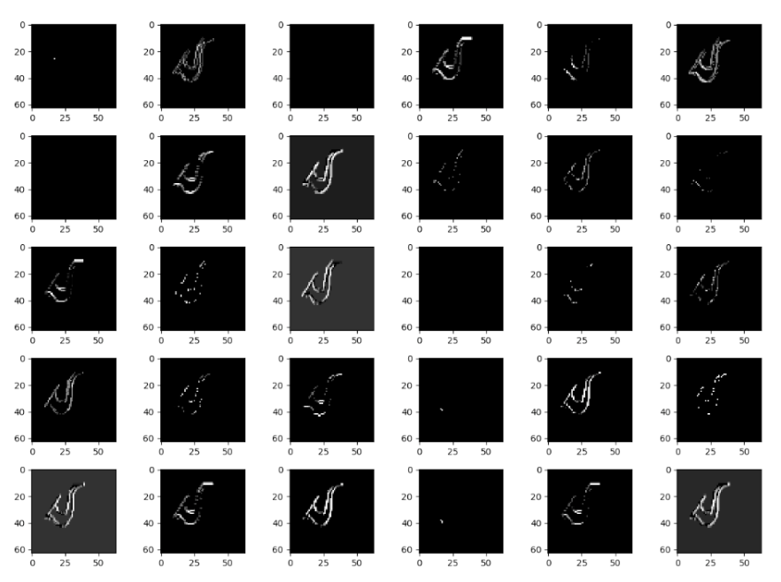 La visualisation est consubstantielle à notre problème puisque nous travaillons avec des images. Nous avons pu découvrir une démarche pour interpréter la prédiction d’un réseau de neurones sur la base d’image, et nous vous proposons les prémisses de cette démarche. L’API de Keras permet d’aller chercher les poids des paramètres (i.e. les valeurs comprises entre 0 et 1 déterminées grâce à la phase d’entraînement) pour chaque neurone. Ainsi on peut afficher la sortie de chaque couche de convolution (ce sont des filtres pour notre image d’entrée), qu’on appellera activations.