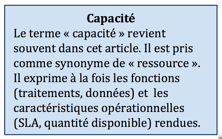 Ainsi, un système d’information modélisé par des capacités et des réseaux pourrait se réaliser par une « simple » instanciation de ressources « cloud » sans mener « un projet spécifique d’infrastructure ». Vision utopique ou réalité ? Le deuxième choix est déjà le bon !