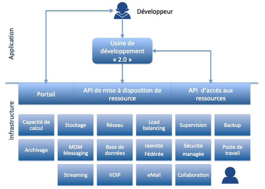 - Les ressources matérielles et logicielles (Machines, OS, stockage… qui permettent de livrer les ressources requises via l’API de mise à disposition). On appelle ces ressources des « Capacités sous-jacentes », non visibles en tant que telles par les utilisateurs de l’API ;