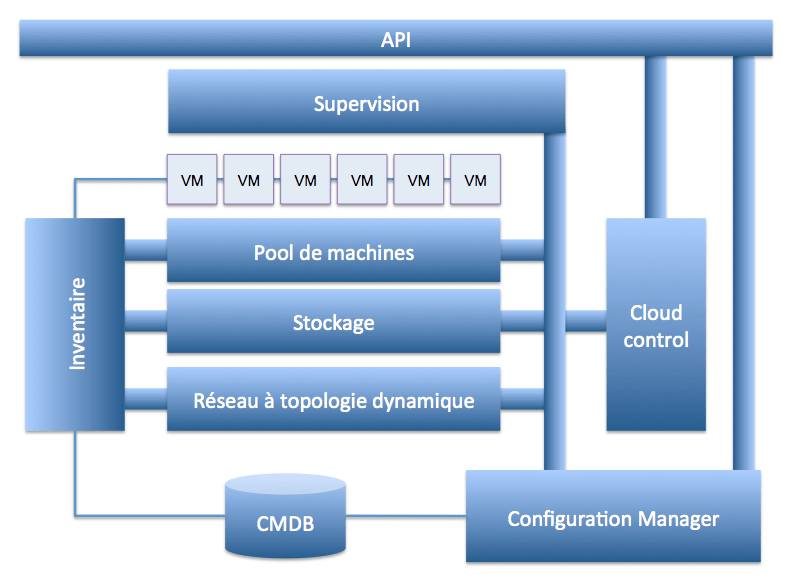 - Le Cloud controller, en association avec le Configuration manager provisionne les capacités demandées via l’API ;