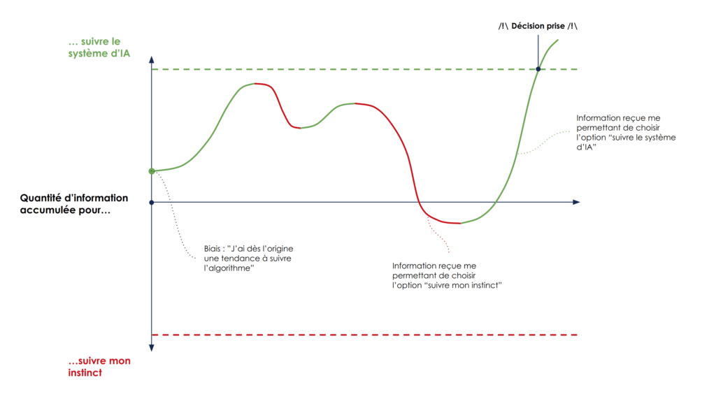 Nous avons vu que la décision de faire confiance à un système d’IA peut être perçue comme le stacking de deux décisions : celle du système (sa recommandation), puis celle de l’utilisateur de suivre ou non cette recommandation dans les cas où il est en désaccord intuitif avec le système.