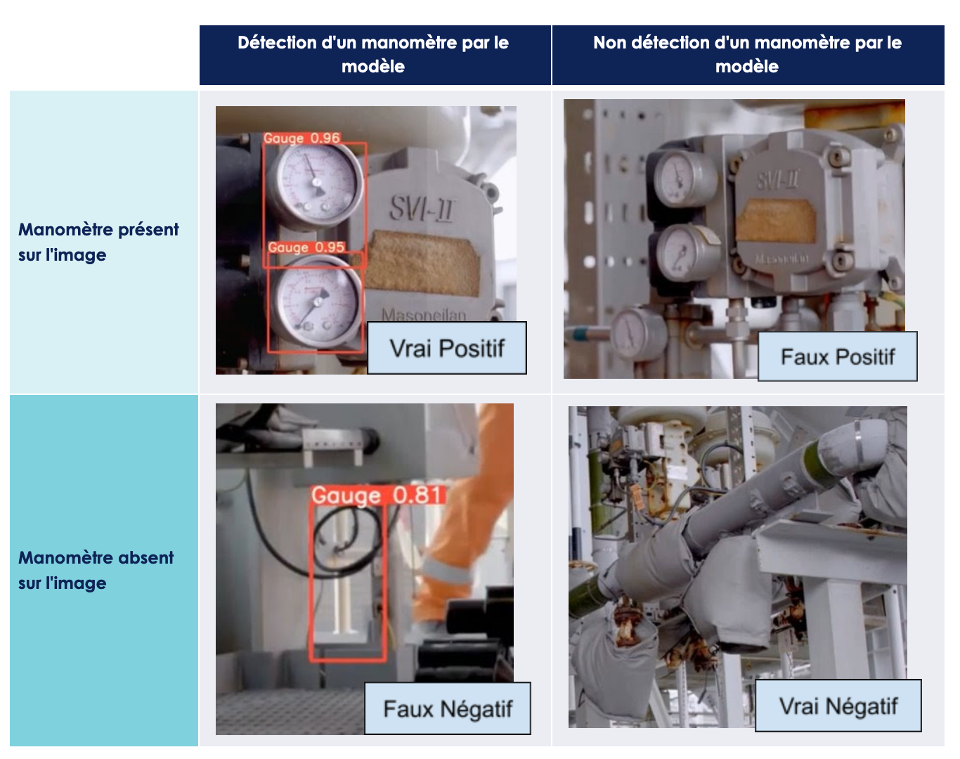 Au cours de ce PoC, nous n’avons eu que les ressources pour faire les tests sur des vidéos issues d'une captation d'un autre chemin de notre environnement 3D (test sur fake). Cependant, dans un objectif de mise en production de ce modèle, il aurait été nécessaire d’effectuer également les mesures de performances sur des vidéos réelles du site industriel (test sur réel). Dans notre cadre d’études, nous nous sommes contentés de détecter les occurrences de faux positifs (le modèle détecte un manomètre alors qu’aucun n’est présent) et faux négatifs (le modèle ne détecte pas les manomètres présents) obtenus et suggérer des causes potentielles.