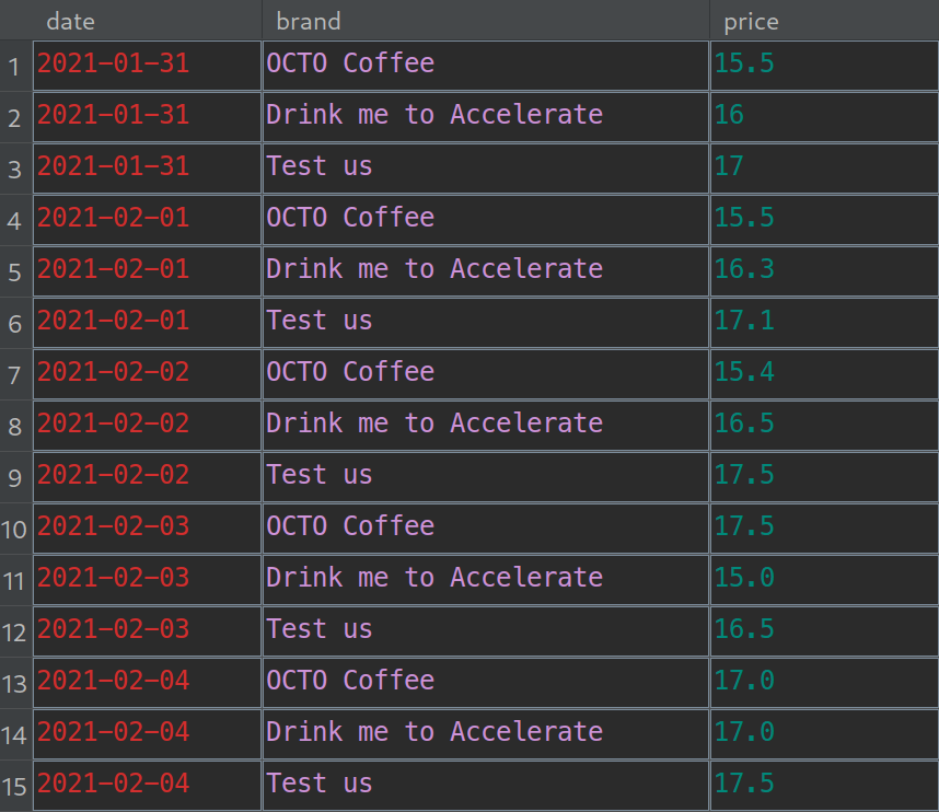 Supposons que le fichier ci-dessus, nommé coffee_prices.csv, se trouve dans le répertoire data/train_data de notre projet.