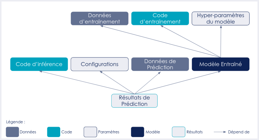 Pour bien appréhender ce qui doit être versionné quand on fait du ML, il est possible de commencer par lister les dépendances de la finalité de toute brique Machine Learning : une prédiction en production.