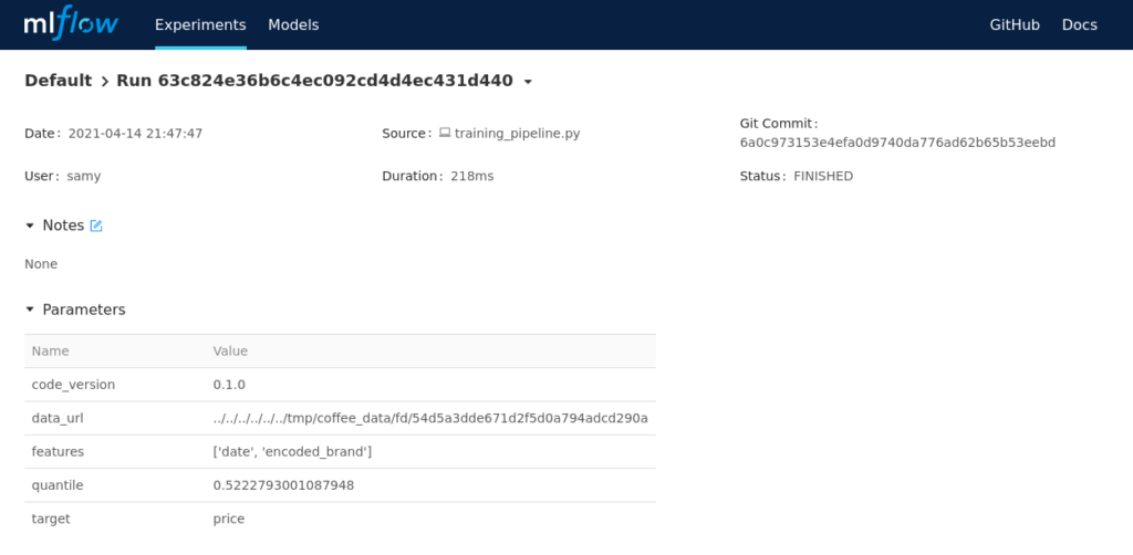Cette information est écrite dans le code, mais l’avoir dans MLflow est plus pratique car elle apparaitra sur la Tracking UI, ce qui permet de comparer les expérimentations sans avoir à regarder le code, en particulier si ce dernier n’évolue pas entre les expérimentations comparées.