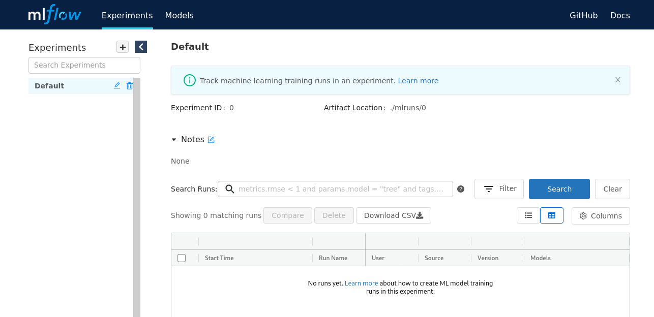 Une fois la base de données créée, le commande lance la Tracking UI. En visitant la page http://localhost:5000 sur un navigateur, la page de la l’interface de suivi des expérimentations s’affiche.