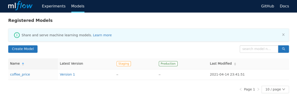 Après avoir nommé notre nouveau registre de modèle et cliquer sur le bouton Register, nous avons notre première version du modèle ajoutée au registre.