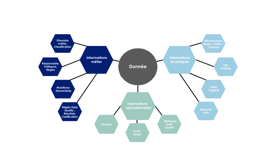 - métier : glossaire, règles, responsables (data owner / data steward…),