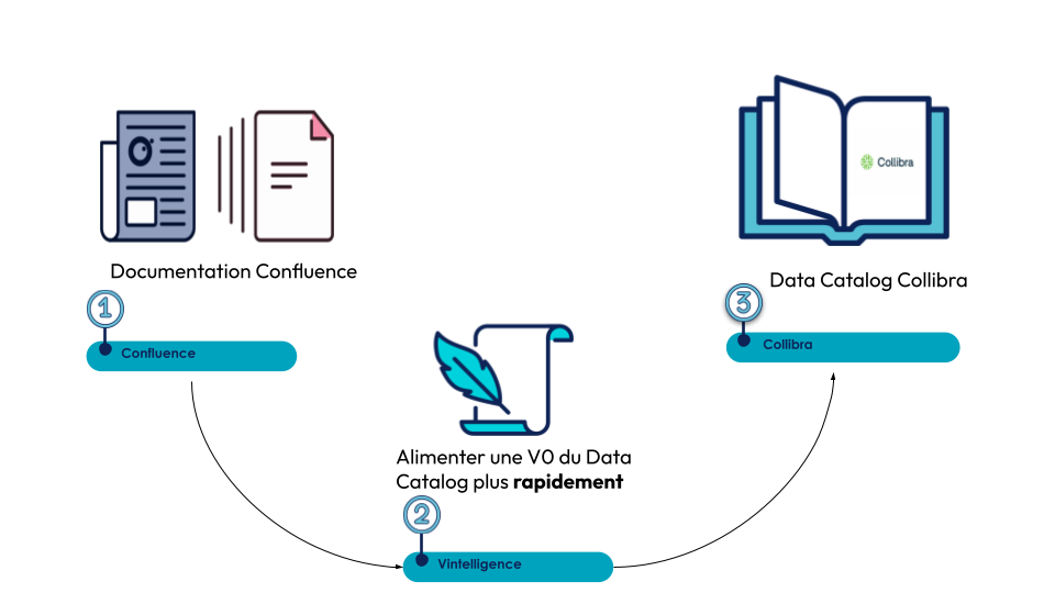 C’est ici que la Gén IA ouvre des perspectives nouvelles. Nous avons expérimenté son potentiel pour automatiser et fluidifier cette étape souvent trop laborieuse. En partant d’un postulat simple – si l’information existe quelque part, alors l’IA peut la retrouver et la restructurer –, nous avons donc conçu une chaîne de traitement capable d’explorer les gisements documentaires (Confluence, SharePoint, documents Office...), d’en extraire les éléments clés, de les formater selon les standards du catalogue de données (par exemple Collibra ou DataGalaxy), puis de soumettre ce pré-travail à validation humaine.
