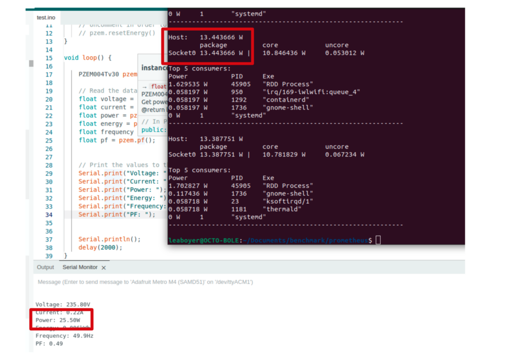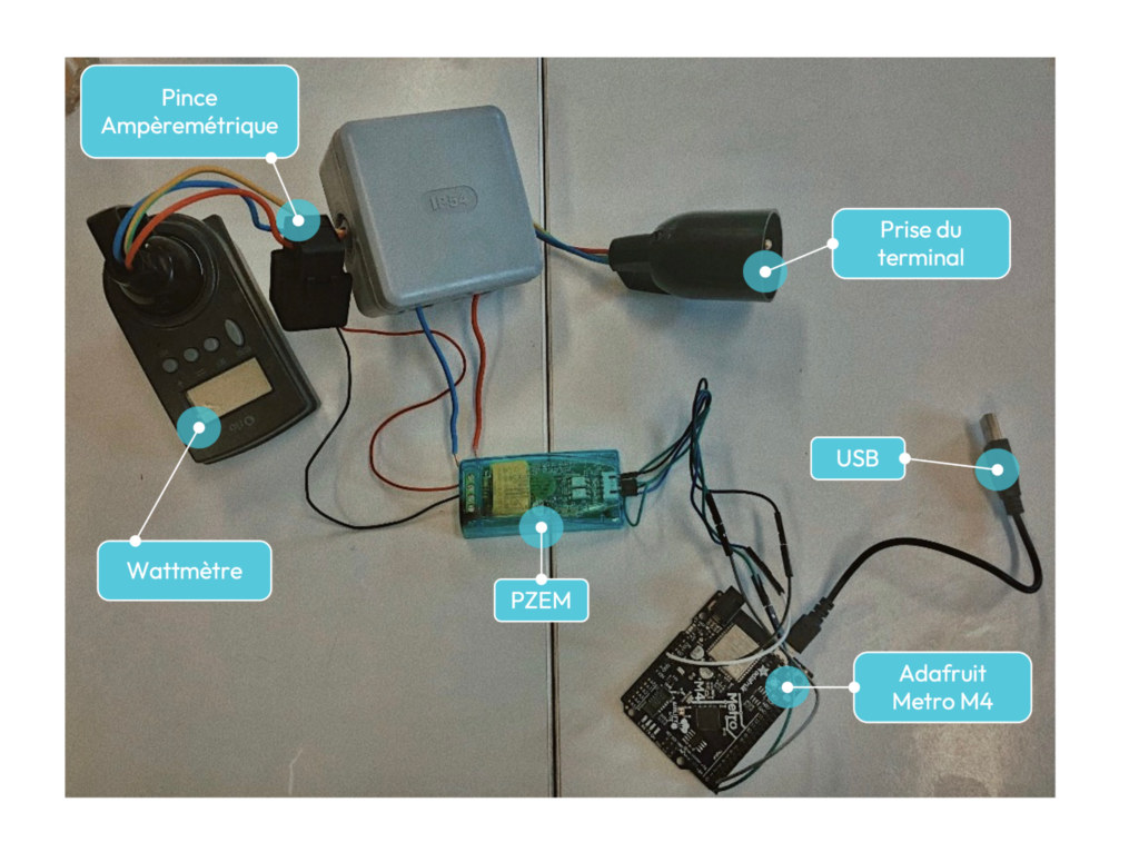 Pour cela, nous avons recours à une étape plus avancée, en utilisant une carte électronique équipée d’un microcontrôleur associé à un compteur énergétique qui permet de déterminer la tension alternative, le courant, la fréquence, le facteur de puissance ainsi que l’énergie active. Dans le cadre de notre expérimentation, nous utilisons une carte Adafruit Metro M4 et module PZEM-004T-100A. Le dispositif Adafruit est connecté au terminal via USB, et le PZEM est installé en dérivation avec une pince ampèremétrique en série. Grâce à un programme spécifiquement conçu pour microcontrôleur Atmega via la librairie du module et un exporteur écrit en Rust, nous avons la possibilité de capturer et d'accéder aux données de consommation en temps réel (modulo la fréquence de traitement). Ces informations seront ensuite traitées et analysées à l'aide de Prometheus-Grafana, il s’agit d’une base de données timeseries et d’un outil de visualisation de ces données. Cela nous permet de visualiser et de comprendre plus précisément la consommation énergétique de notre terminal en exploitant l’outil avec différents scénarios en confrontant les courbes d’analyse.