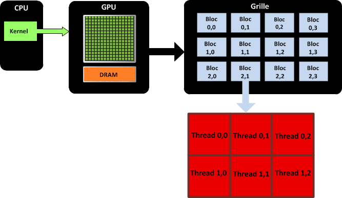 L’exécution des threads d’un même bloc est regroupé en paquets appelés warp (ensemble de 32 threads). Chaque thread dans un bloc exécute une instance d’un kernel et a des coordonnées dans ce bloc. Un bloc possède aussi des coordonnées dans la grille. Cela permet de distinguer chaque thread les uns des autres pour identifier la partie de travail qui lui revient.