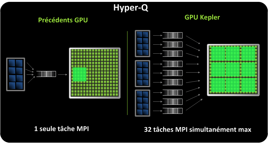 Kepler progresse dans ce domaine avec Hyper-Q. Il augmente considérablement le nombre de connexions entre host de device avec 32 connexions hardwares simultanées. Chaque processus MPI peut être assigné à une queue, maximisant l’utilisation du GPU.