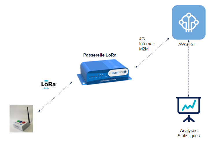 L’architecture, étudiée en collaboration avec Zerfos.Systems qui implémente le bouton, s’appuie sur les matériels de Multitech. Ce choix a été réalisé pour le bon compromis - simplicité de mise en œuvre - performance - coûts. D’autres matériels leader tels que Kerlink nous ont paru trop chers pour l’usage que nous envisagions. A noter que de nombreuses offres matérielles de passerelles existent.