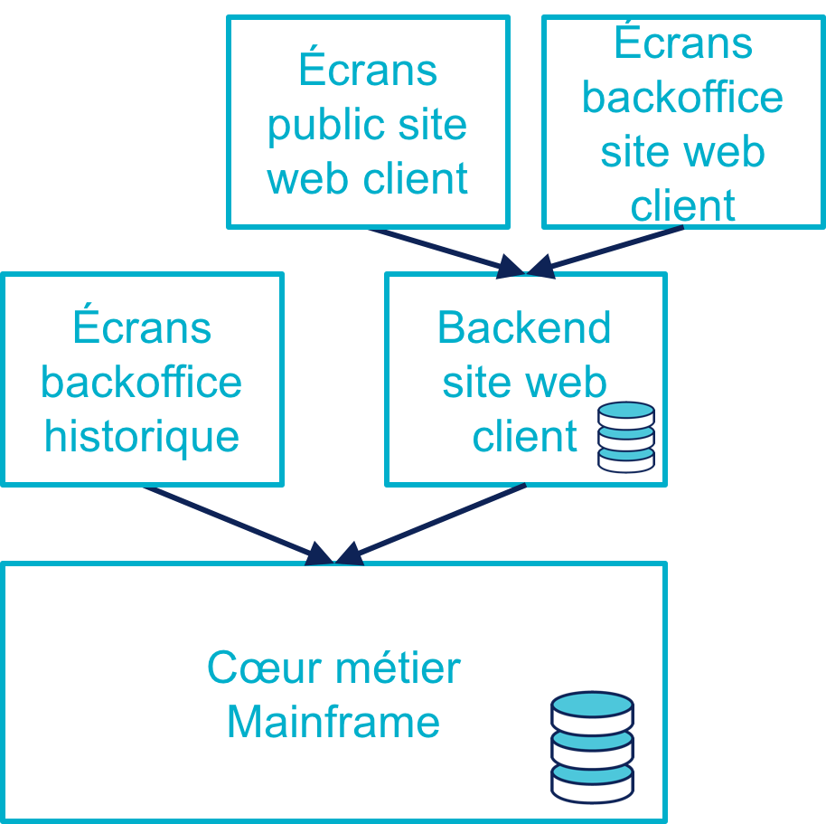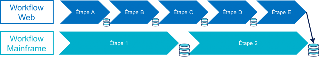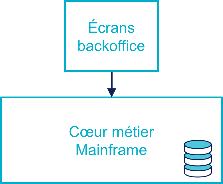 Les écrans de backoffice ont souvent été remplacés par des technologies web. Mais pour limiter les impacts sur le mainframe, on conservera souvent les mêmes workflows, le nouveau backoffice n’aura donc pas à stocker de données.