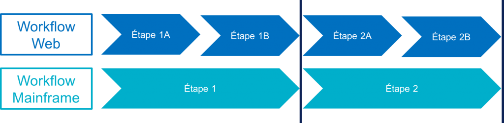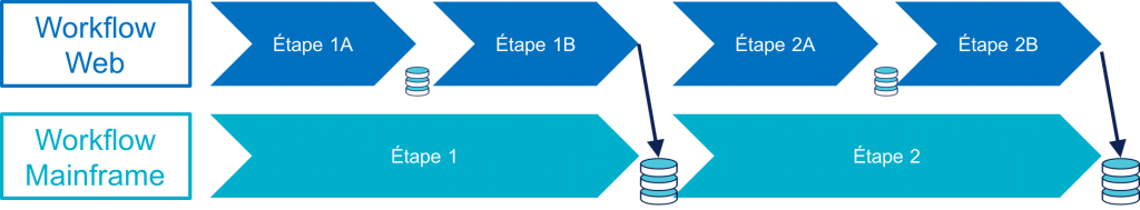 Il est dans ce cas impossible de stocker les résultats des étapes 1A ou 2A dans le mainframe. Ils seront donc stockés dans le backend du site web dans une base de données séparée. Cela signifie aussi qu’il faudra dupliquer les contrôles de saisie de ces étapes dans la partie web, pour éviter d’avoir à revenir en arrière dans les écrans du site web.