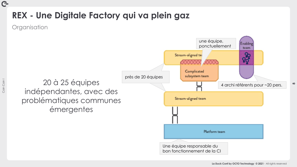L’organisation de cette Digital Factory, c’est plus de 200 personnes réparties sur une vingtaine équipes. Initialement fondue dans un framework SAFe, elle a peu à peu glissé vers une autre topologie, du fait la grande indépendance des équipes :
