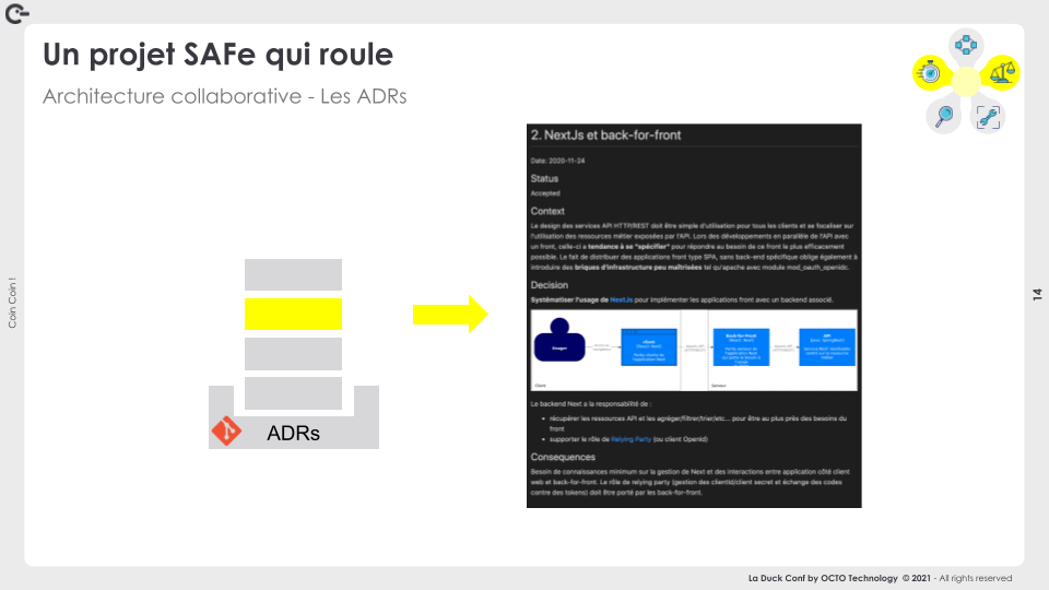 Ces décisions s'empilent comme des logs (car le “cadrage 0” parfait n'existe pas) et se font à plusieurs niveaux : des décisions centrales ou plus locales, concernant uniquement une équipe voire un seul composant. Elles sont stockées et versionnées comme du code, avec des outils classiques pour des développeurs et les bonnes pratiques associées.
