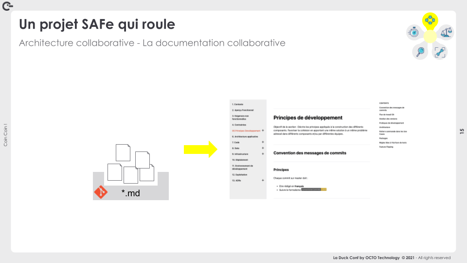 En complément de ces ADR, on maintient une documentation collaborative, sous forme de Markdown, elle aussi versionnée. Comme dans la hiérarchie des ADR, la documentation peut être centrale ou locale. Cette documentation décentralisée est une force car centraliser toutes les décisions et la documentation est un travail fatiguant qui peut faire peur. On préfère conserver la connaissance, la partager aux yeux de tous, puis, par la suite, si l'on souhaite mettre en commun des éléments, il sera possible de faire un refactoring.