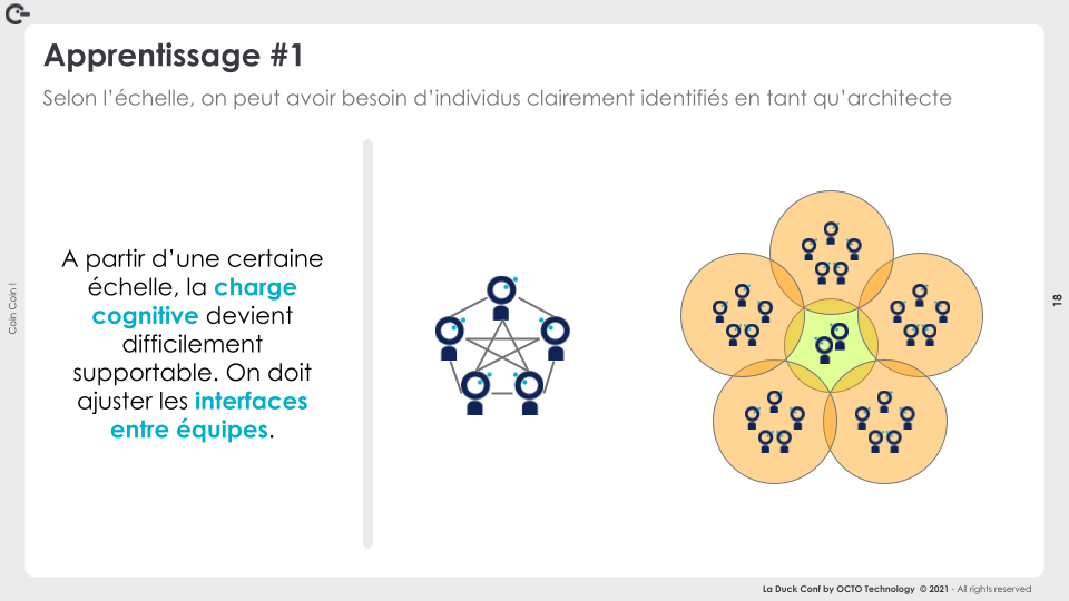 • Apprentissage #1 : avec l'agrandissement d’échelle, on a besoin d'individus clairement identifiés. La charge mentale nécessaire associée passe mal l'échelle : les échanges doivent être plus structurés.