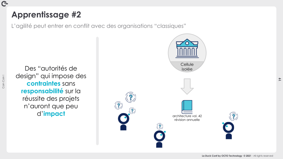 • Apprentissage #2 : l'agilité peut entrer en conflit avec des organisations classiques. La cellule "isolée", très "descendante", n'a que peu de chances d'être efficace. Les équipes d'architectes doivent se rendre compte des impacts des décisions et des retours des équipes de développement. Il vaut mieux susciter l’intérêt plutôt que d’imposer la contrainte (anti-pattern : “authority without responsibility").