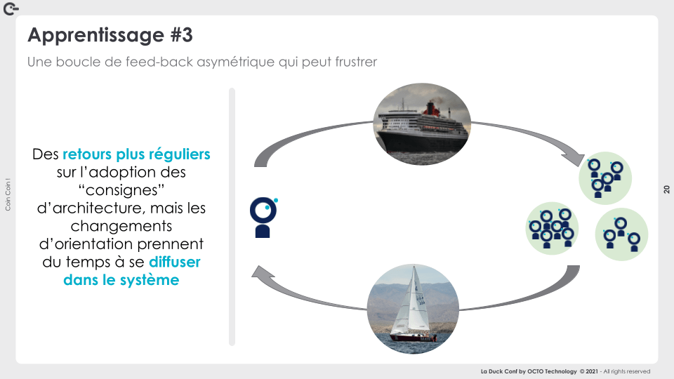• Apprentissage #3 : la boucle de feedback asymétrique peut être frustrante pour les architectes. L'agile permet des retours réguliers qui permettent de se rendre compte rapidement des impacts, mais lorsqu'il faut changer de direction, cela peut être plus compliqué et prendre davantage de de temps sur les décisions d'architecture faites en centrale. Attention à la frustration de n'avoir qu'une moitié de la boucle de feedback qui s'accélère !