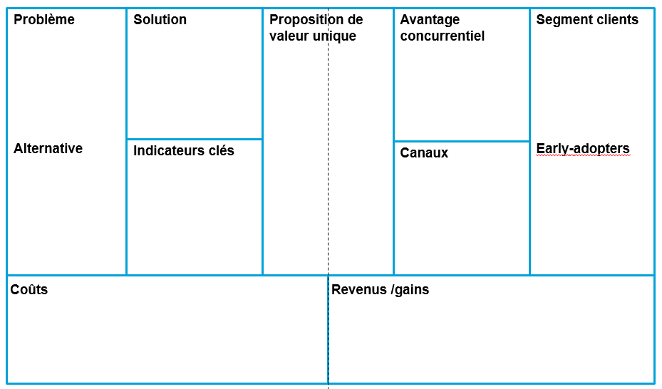 Faites le test : dessinez ce canvas sur un brouillon, vous le remplirez pour votre projet en lisant les paragraphes suivants. (Vous pouvez aussi utiliser ce template GoogleDoc)