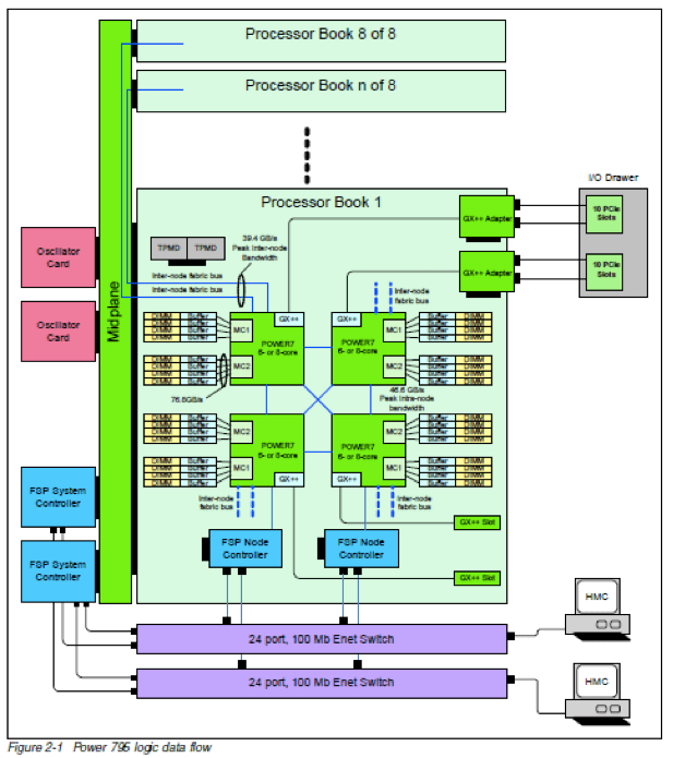 [9] Un processor book est un compartiment regroupant processeurs, mémoire et connecteurs d’entrée sortie, comparable en première approche à une carte mère. Les grands systèmes SMP sont constitués d’un ensemble de ces compartiments reliés entre eux par une seconde carte : le midplane.