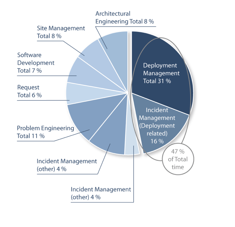 Un des points de friction les plus visibles dans le manque de collaboration entre dev et ops se trouve au niveau des phases de déploiement. C’est d’ailleurs l’activité qui se montre être la plus consommatrice en ressources : la moitié du temps de la production est ainsi consommée par le déploiement ou des problèmes liés au déploiement.