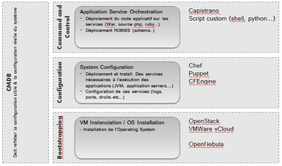 Ces outils visent à permettre le codage (dans des langages qui leur sont propres) des infrastructures : installation et démarrage d’un service http, du serveur tomcat, création des répertoires pour les fichiers de logs…