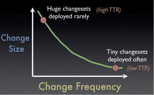 Autrement dit, plus les modifications apportées entre deux mises en production sont grandes (ie. le volume de code modifiée est important), plus la capacité à corriger rapidement un problème survenu suite au déploiement (donc la phase d’instabilité tant redoutée par les « Ops ») diminue (et donc le TTR augmente).