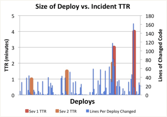 Pour finir, la figure 5, issue d’une étude de Flickr, montre la corrélation entre les TTR (et donc la sévérité des incidents) en fonction du volume de code déployé (et donc de la quantité de changement introduit).