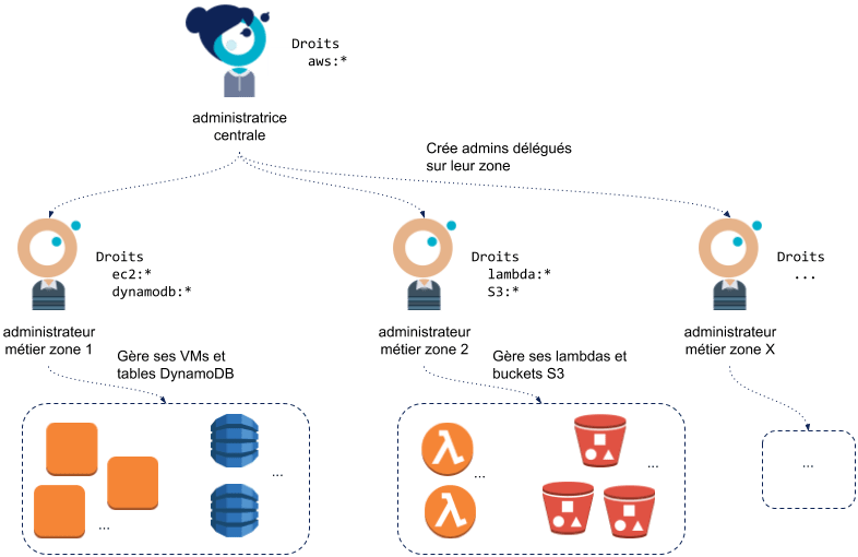 Ce pattern est facilement implémentable dans AWS à l'aide du service transverse IAM. A travers les policies IAM, un admin central peut modéliser finement les droits nécessaires à un admin métier, et les lui fournir.